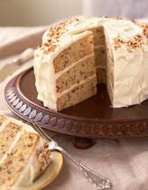 Whip browned butter and butter together. Blend confectioner's sugar with butter mixture, 1 tsp vanilla and 1/4 cup heavy whipping cream. Add more whipping cream if necessary, a little at a time. Whip the icing to get it light. At this point, you can add the remaining pecans to the icing or, you can frost the cake and use the pecans to decorate the top. Whichever you choose, you will not regret it. SO yummy!!! You should probably just plan on taking it somewhere because if you keep it at home, you will gain 10 pounds. Believe me. I learned it the hard way. :)